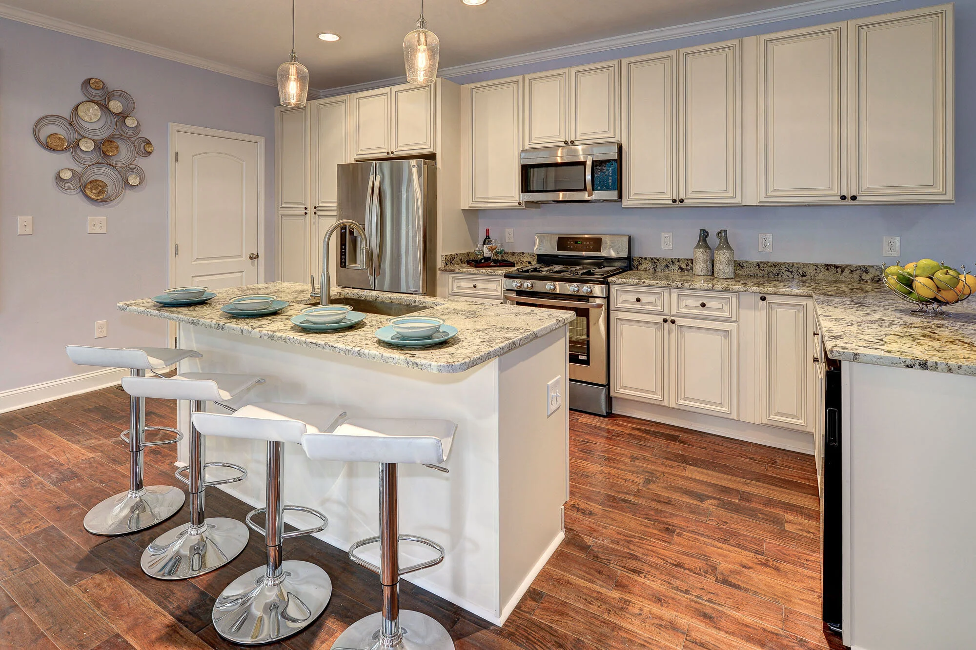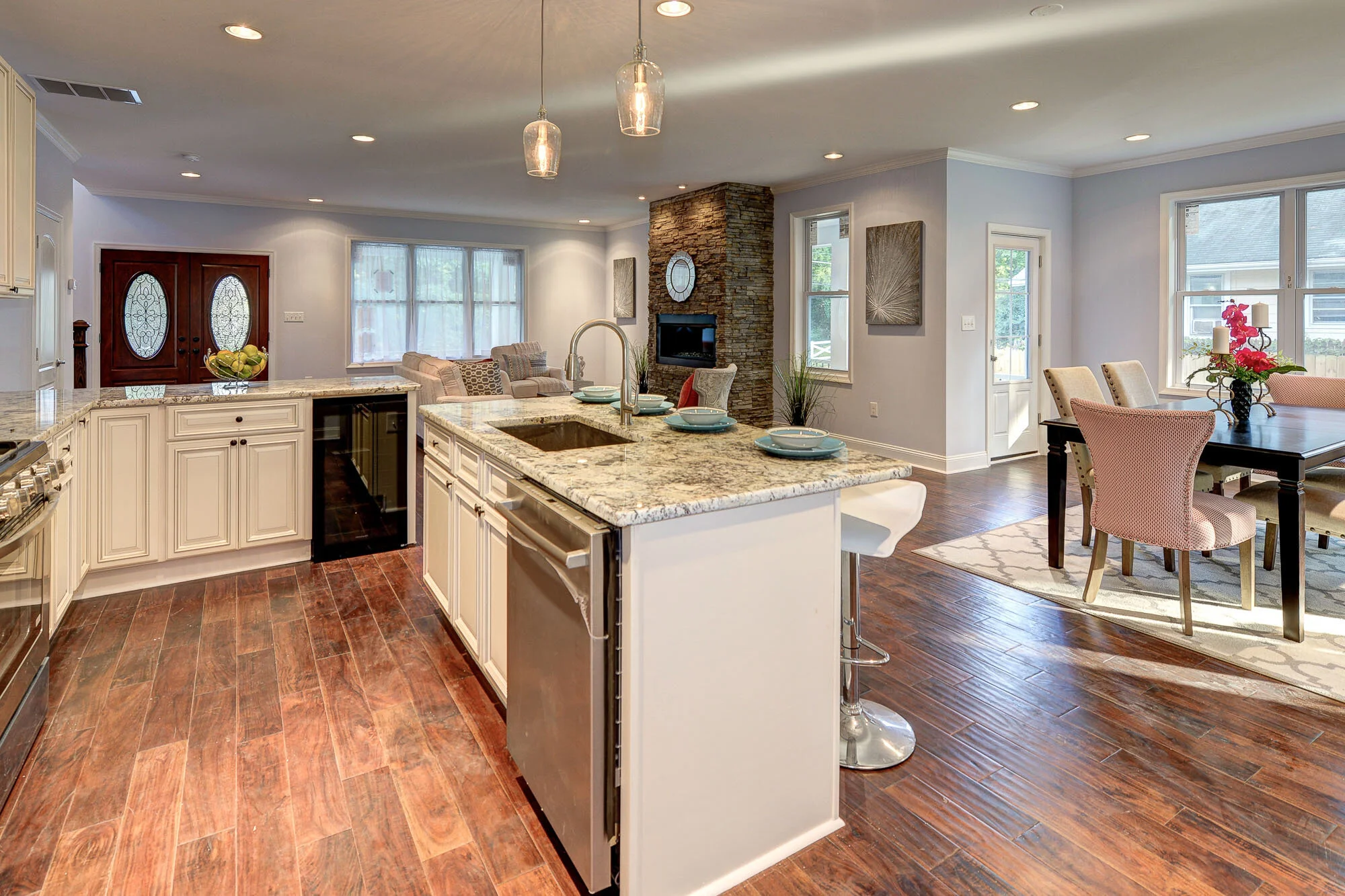 Expansive open floor plan design with modern touches. Our approach to designing this home was for the family who loves to entertain – free flowing movement for family and guests. Burnished Acacia 5” hand scraped hardwood floors, statement-making slate stone fireplace floor to ceiling surround and the ever-popular icy waterfall on all of the walls.